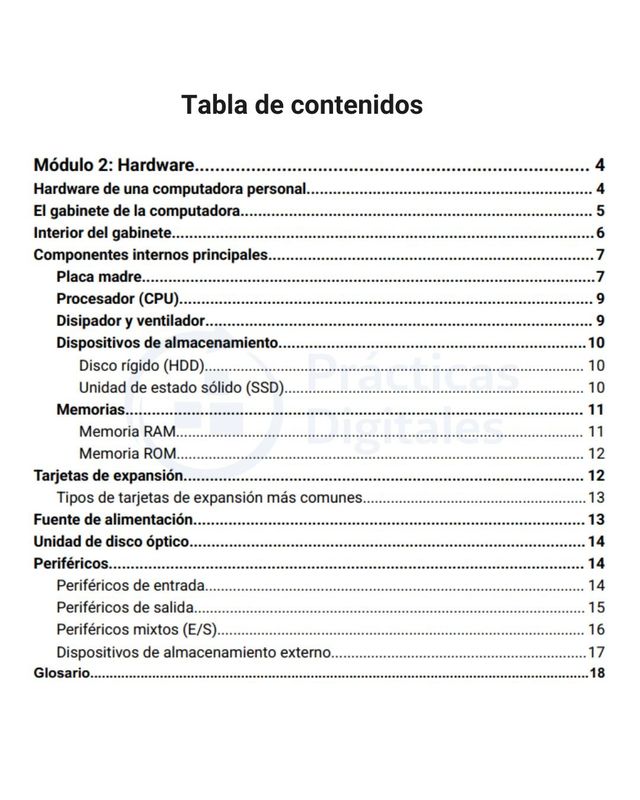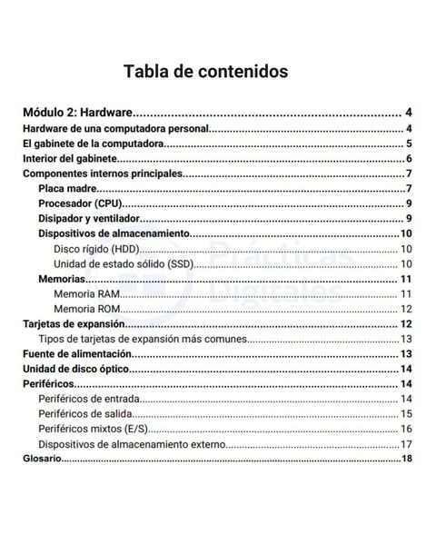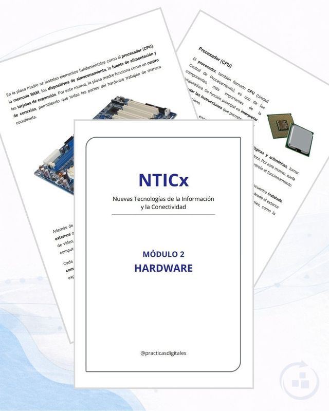 Material educativo en PDF sobre componentes físicos de la computadora. Placa madre, procesador (CPU), memorias, dispositivos de almacenamiento.
